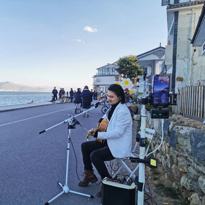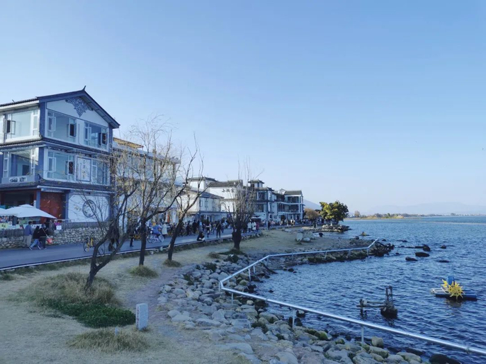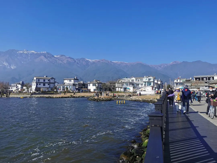 下午2点多,气温大约17℃,洱海边的风力大概有4-5级,天空碧蓝如洗,没有一丝云彩,一如往常的冬季。磻溪S湾游客众多,步行和骑单车的人流交织在一起。有三五个歌手架起了直播支架,在S湾的转弯阴影处弹吉他,唱民谣,大方地让路人拍照。沿途依然有几个本地阿姨叫卖,编脏辫或者卖气球。小吃摊上售卖烤肠冰淇淋手打柠檬茶等等。