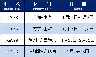 上海铁路客户服务中心提示,恢复开行G7068(上海—南京)、G3142(深圳北—合肥南)等车次。同时增开G9240(上海虹桥—南京)、G9234(上海虹桥—连云港)等车次,详见↓