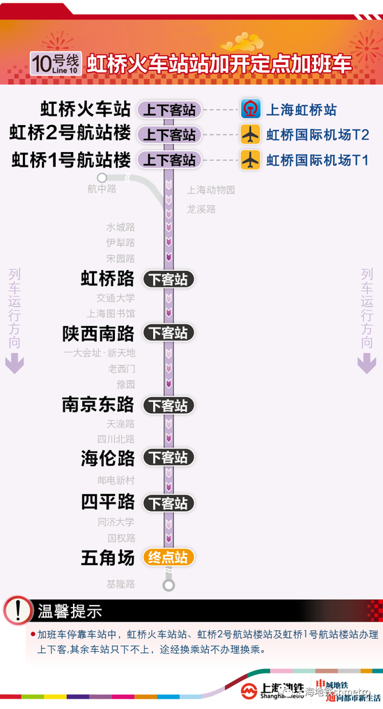 10号线虹桥火车站站往五角场站方向定点加班车,沿途仅停靠虹桥火车站站、虹桥2号航站楼站、虹桥1号航站楼站、虹桥路站、陕西南路站、南京东路站、海伦路站、四平路站、五角场站,其余车站跳停。停靠车站中,虹桥火车站站、虹桥2号航站楼站、虹桥1号航站楼站可上下客,其余车站只下不上,途经换乘站不可换乘。
