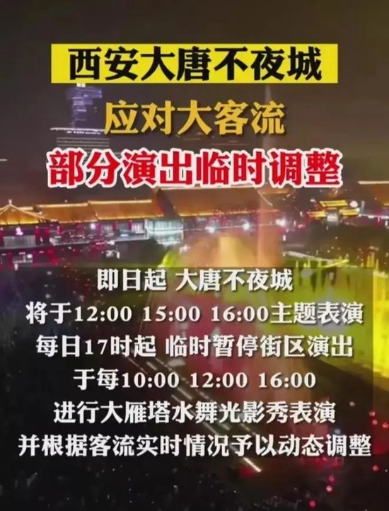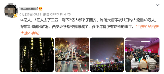 甚至由于人员太多,大唐不夜城主办方只能宣布取消演出节目,怕出现踩踏事件。