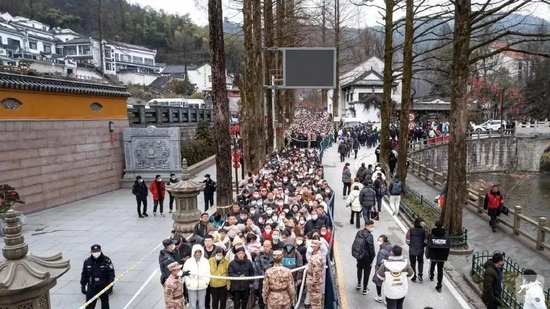 报道称,从1月26日上午5时开始,为保障游客通行安全,九华山风景区管委会启动旅游高峰应急预案,适时增派警力40余人,现场拉起隔离带,多点安抚游客情绪,维持现场秩序。“针对今天游客众多的情况,我们公安部门采取了物理隔离、人墙分隔、喊话提醒等措施,确保游客有序安全通行上山。”九华山风景区公安局相关负责人介绍。