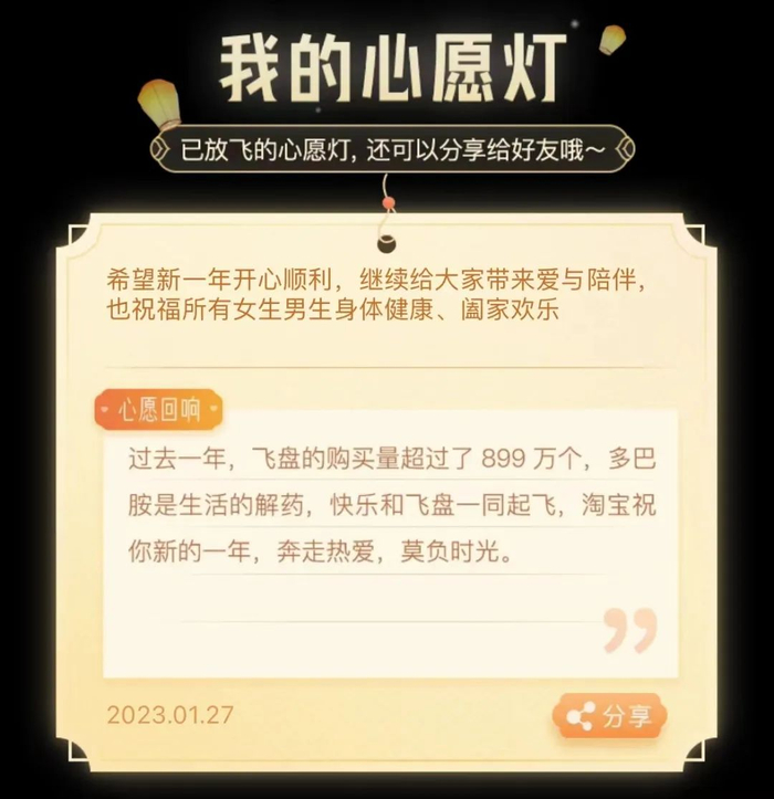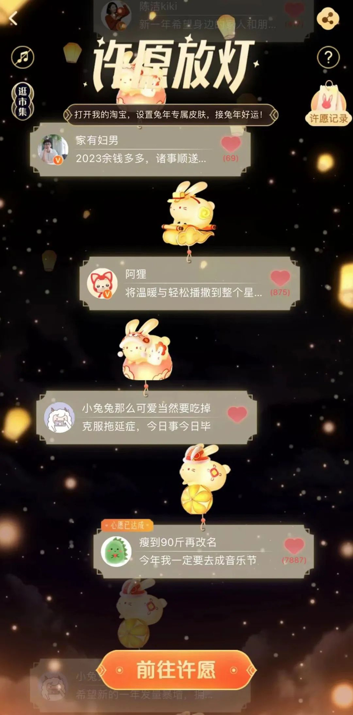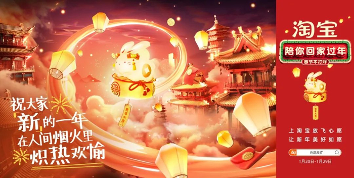 春节假期,数以亿计的用户、商家、达人、主播到淘宝搜索“许愿放灯”,在淘宝心愿广场写下心愿,然后放飞一只“赛博兔子灯”。每一个或宏大或朴实无华的愿望,都有来自淘宝真诚的回声。