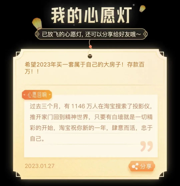 达人“百万小杨”许愿:希望2023年买一套属于自己的大房子!存款百万!收到淘宝回信:“过去三个月,有1146万人在淘宝搜索了投影仪,推开家门回到精神世界,只要有白墙就是一切精彩的开始,淘宝祝你新的一年,肆意而活,忠于自己。”