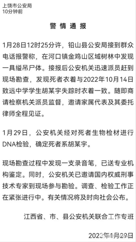 江西省、市、县公安机关联合工作专班1月7日通报,2022年10月14日,胡鑫宇在上饶市铅山县私立致远中学校内失踪,10月15日接到报警后即组织开展调查搜寻工作。当地会同应急管理、消防救援、教体、城管等部门,联合平安义警、蓝天救援、绿洲救援等社会力量,搜索了学校南侧树林山岗约589亩、铅山县至余干县信江河段约200公里、峰福铁路沿线约22公里;走访了学校附近的2238户居民、159家企业、951辆客货车的司机、全县226处庙宇道观、25家养老机构和1家救助站;排查了72个水塘、运用声呐探查了3个水库;反复查看、交叉复核了6471.5小时的监控视频和31.7万余张交通卡口抓拍照片;先后4次派员赴福建、浙江等胡某宇曾生活或可能前往的区域查找。铅山县委、县政府广泛发动村居干部、护山守林员和广大群众,在全县范围内开展了3轮搜寻工作。从1月9日开始,当地警方组织对胡鑫宇进行大规模搜寻。网上视频显示,参与搜寻的人黑压压一片集合,很多人打着雨伞,拿着镰刀、木棍和手杖。