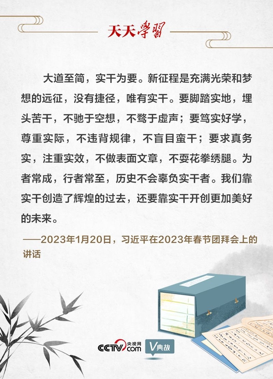 1月20日举行的2023年春节团拜会上,习近平总书记指出,新征程是充满光荣和梦想的远征,没有捷径,唯有实干。他引用古语“为者常成,行者常至”,发出新春号召:历史不会辜负实干者。我们靠实干创造了辉煌的过去,还要靠实干开创更加美好的未来。