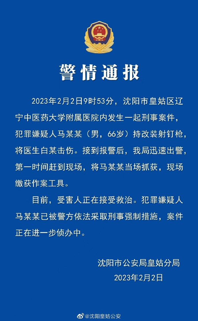 ·一男子持改装射钉枪击伤医生,沈阳警方通报:犯罪嫌疑人已被依法采取刑事强制措施。