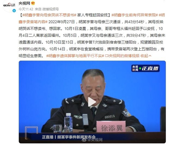 2022年9月27日,曾与母亲三次通话,共43分54秒,其母反映胡鑫宇哭诉不想读书、想回家。