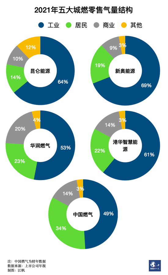 与其他四大城燃相比,中国燃气的居民用气占比最高。2021财年,中国燃气民生用气74亿立方米,占全年零售气量的34%。2021年,昆仑能源(0135.HK)、新奥能源、华润燃气、港华智慧能源民生用气占各自零售气量的14%、19%、23%、22%。