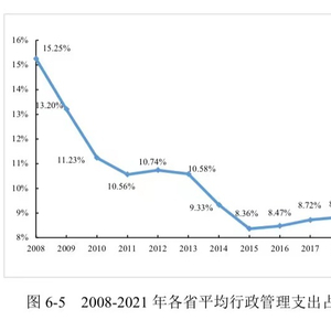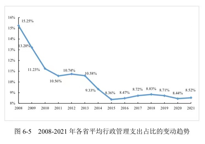 根据中国人民大学财税研究所《中国各地区财政发展指数报告2022》,2008年以来中国行政管理支出占一般公共预算支出比重有力显著下降,从2008年的15.25%降至2021年8%左右,尤其近年在8%左右小幅波动。