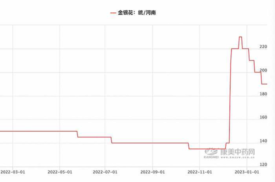金银花的原料价格也上演了类似的“疯狂”。界面新闻走访现场的金银花批发商户得知,在2022年底短短不到一个星期内,统货金银花的价格也同比上涨,从2022年12月9日最初的140元/kg涨至12月23日最高时的230元/kg。