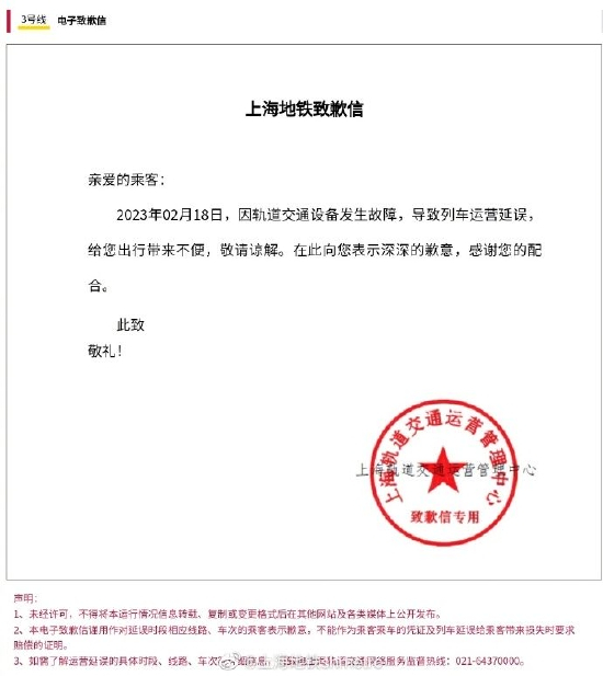 2023年02月18日,因轨道交通设备发生故障,导致列车运营延误,给您出行带来不便,敬请谅解。在此向您表示深深的歉意,感谢您的配合。