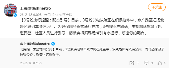 上海地铁3号线供电设备故障仍在处置中