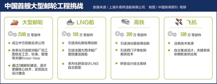 “作为舶来品,邮轮经历了百年发展和积累,是名副其实的巨系统工程,可以直接反映一个国家装备建造能力和综合科技水平。”邮轮的设计参与者、上海外高桥造船有限公司开发部负责人李嘉宁告诉《中国新闻周刊》,邮轮的整船零件数相当于C919大飞机的5倍,是“复兴”号高铁的13倍,而庞大的体量和复杂的工程使“引进、消化、吸收、再创新”的每一个环节都难度倍增。