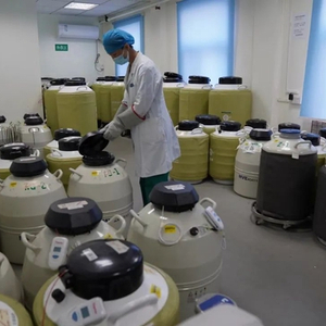 中新社国是直通车近日来到北京大学第三医院精子库。高可过膝的粗重金属罐,像半个巨大胶囊,一排排墩在地上摆放,让整个房间充斥着厚重感。