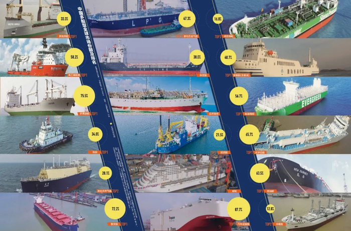 中国船舶工业行业协会最新报告表明,在全球18种主要船型中,中国共有12种船型新接订单位列世界第一。其中,新接散货船、集装箱船、汽车运输船和原油船新接订单分别占全球总量的74.3%、56.8%、88.7%和66.1%。特别是在大型LNG船领域,2022年新接大型LNG船订单国际市场份额首次超过30%。