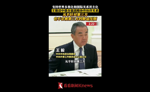 当地时间2月22日,中共中央政治局委员、中央外事工作委员会办公室主任王毅在莫斯科与俄罗斯总统普京举行会晤。