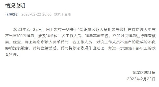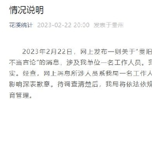 2023年2月22日,网上发布一则关于“贵阳某公职人员相亲失败后在微信聊天中有不当言论”的消息,涉及我单位一名工作人员。我局高度重视,立即对该消息进行调查核实。经查,网上消息所涉人员系我局一名工作人员,对该工作人员不当言论造成的不良影响深表歉意。待调查清楚后,我局将依法依规作出处理,并进一步加强干部职工的教育管理。