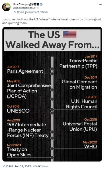 与此同时,华春莹还在发布的另一则推特帖子中讽刺称,“只是提醒一下,美国是如何‘遵守’国际规则的——是通过抛弃并退出(国际规则)!”
