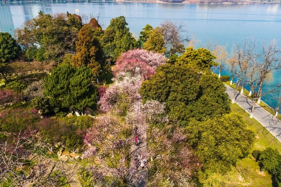 落花满春光,疏柳映新塘。玄武湖畔,2300株梅花伴着春风陆续开放,点点绯红散落在湖边路道或是江心小岛,引得踏青赏春的市民游客纷纷伫足。