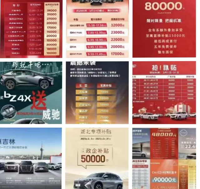特斯拉在新年伊始便以Model 3等车型入华以来的最低价打响今年车市价格战第一枪。随后、问界、小鹏汽车、广汽埃安、广汽丰田、东风日产等车企纷纷加入价格战之列。目前,价格战不断升级。湖北省3月以来掀起的史上最强购车优惠潮,进一步将战火从电动车领域引到燃油车领域,最备受关注是指导价为21.19万元的东风雪铁龙C6,在政企联合补贴下直降9万元,这款B级燃油车以12.19万元冲入A级车的价格区位。与此同时,其他车企和经销商也纷纷加入降价行动。一汽集团3月面向吉林省推出1.5亿元限时购车补贴活动,涵盖红旗、一汽-大众、一汽奥迪、一汽丰田等品牌。奇瑞和长安则推出了百亿惠民购车季。