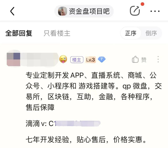 在贴吧,有人专门打出资金盘类软件开发的小广告,对接项目方。