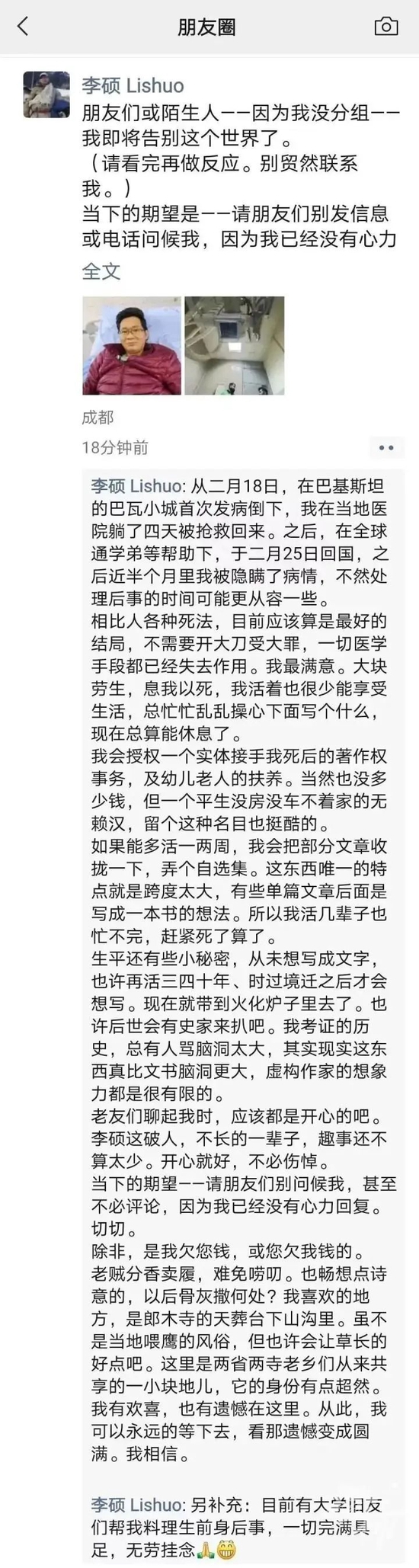 最后,李硕表示:“目前有大学旧友们帮我料理生前身后事,一切完满具足,无劳挂念。