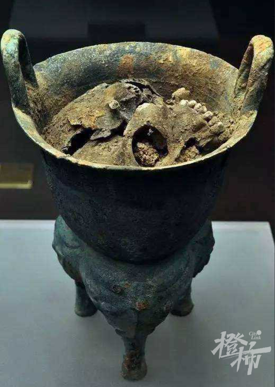 安阳殷墟出土的青铜甗,其中盛放着一具少女的头骨