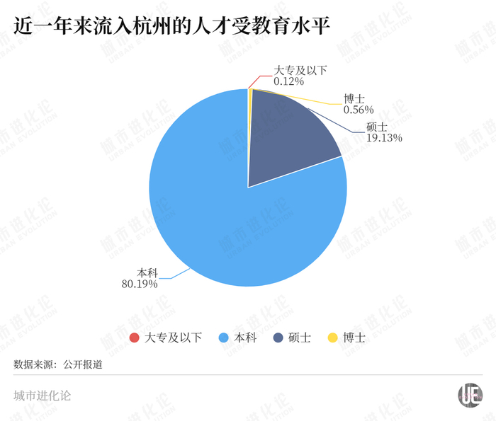 另一方面,杭州较高的引人门槛,一定程度上阻挡了更多技能人才、服务人员的流入。据浙江日报引用猎聘网数据,近一年来,在流入杭州的人才中,大专及以下学历仅占0.12%。这意味着,杭州仍然具备很大的引人空间。