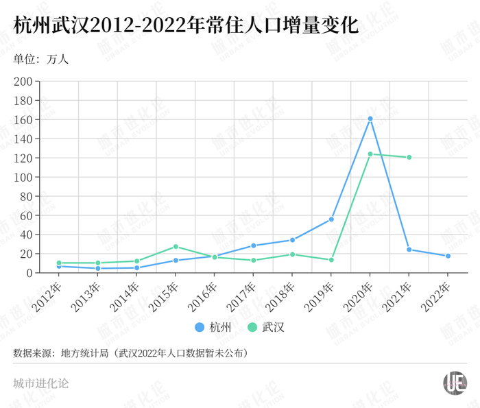 不同于杭州一度收紧,武汉专科落户的政策延续,在2020、2021年连续两年实现人口超百万的增长。若按住建部公布的《2021年城市建设统计年鉴》,武汉2021年城区常住人口1093.84万人,已达到超大城市标准,同期杭州为993.18万人,距离超大城市尚有差距。