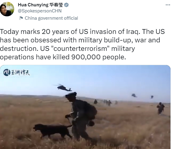 美国入侵伊拉克20周年当天,华春莹发了一条推特