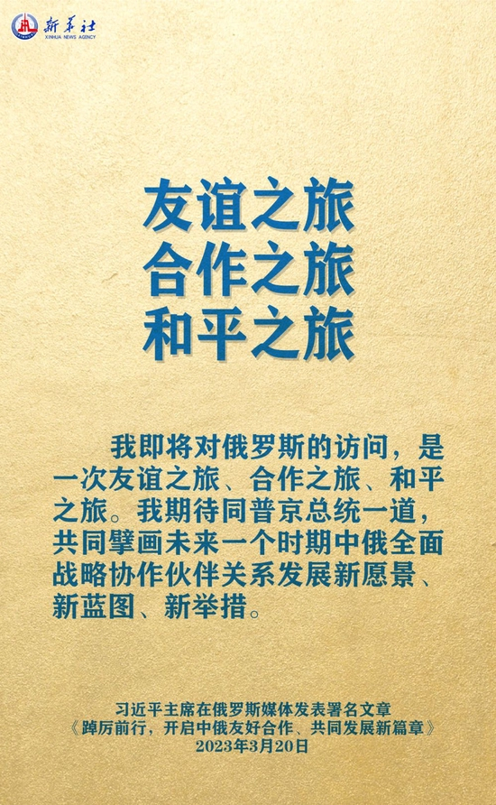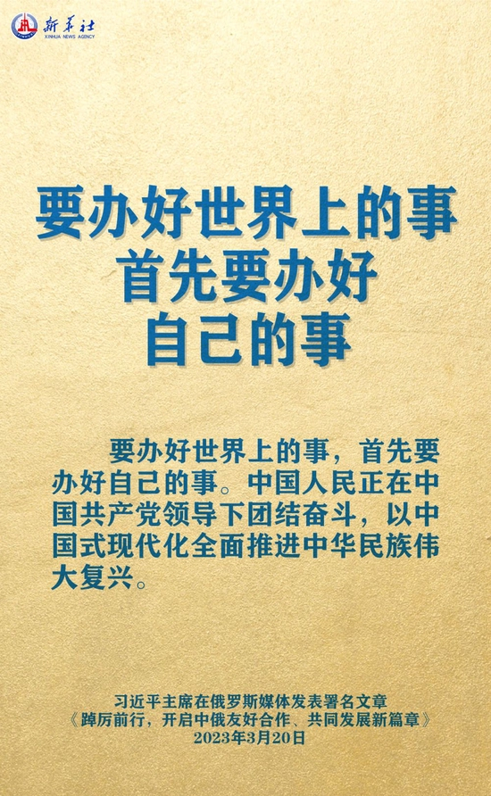 3月20日,在赴莫斯科对俄罗斯联邦进行国事访问之际,国家主席习近平在《俄罗斯报》和俄新社网站发表题为《踔厉前行,开启中俄友好合作、共同发展新篇章》的署名文章。