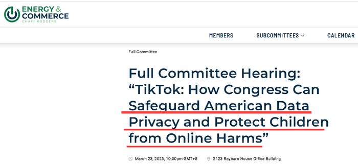北京时间3月23日晚10点,美国国会众议院能源和商业委员针对风靡美国的短视频社交平台TikTok举行了一场听证会。尽管这场听证会打出的旗号是“保护美国人的数据隐私和儿童安全”,可从实际的现场直播来看,耿直哥认为这场听证会几乎就是一场对TikTok这家私企的政治抹黑狂欢。