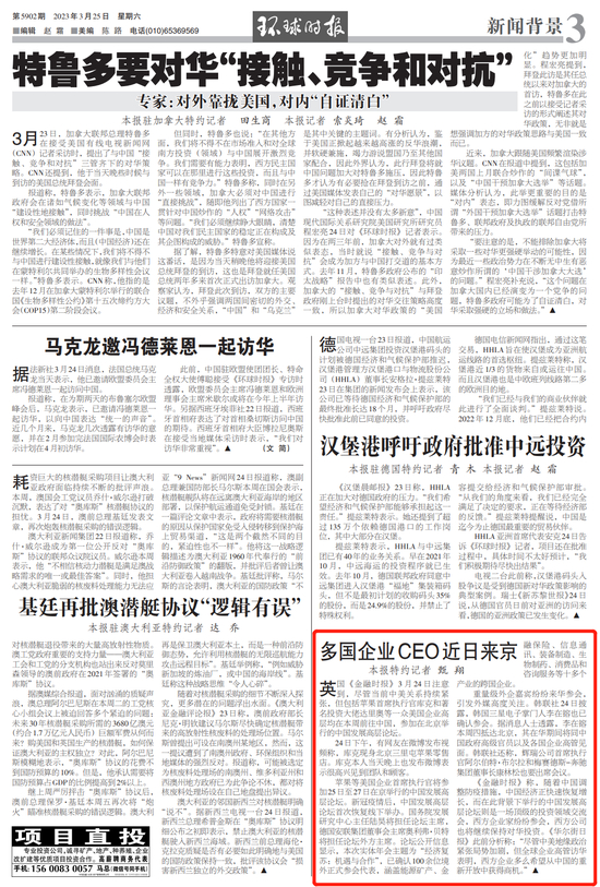 重量级外企嘉宾纷纷来华参会,引发外媒高度关注。韩联社24日披露,韩国三星电子掌门人李在镕也已确认参会。据消息人士透露,李在镕本周四抵达北京,其在华期间将同中国政府高级官员以及各国企业高管见面。韩联社还称,辉瑞公司首席执行官阿尔伯特·布尔拉和梅赛德斯-奔驰集团董事长康林松也要出席会议。《金融时报》称,随着中国调整防疫措施,中国经济正快速恢复增长,而在此背景下举行的中国发展高层论坛则是一场顶级的投资领域交流会,西方企业家纷纷参会,西方公司也将继续保持对华投资。《华尔街日报》此前分析称:“尽管中美地缘政治紧张局势加剧,但全球企业高管访华表明,西方企业多么希望从中国的重新开放中获得商机。”