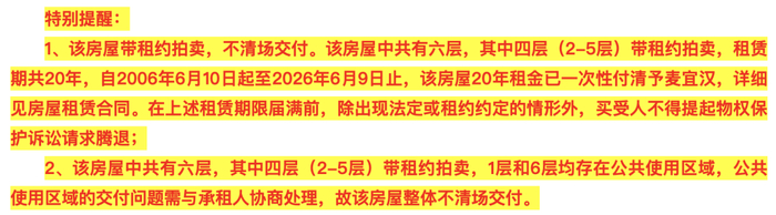 该房源带租约拍卖,不清场交付。房源共有6层,其中四层(2-5层)带租约拍卖,租赁期共20年,自2006年6月10日起至2026年6月9日止,该房屋20年租金已一次性付清。1层和6层均存在公共使用区域,公共使用区域的交付问题需与承租人协商处理。