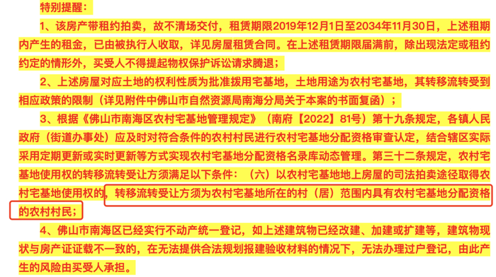 阿里法拍竞买公告也显示,上述房源因是集体土地性质的房地产,买受人须具备宅基地不动产受让资格条件。佛山市南海区已经实行不动产统一登记,如上述建筑物已经改建、加建或扩建等,建筑物现状与房产证证载不一致的,在无法提供合法规划报建验收材料的情况下,无法办理过户登记,由此产生的风险由买受人承担。