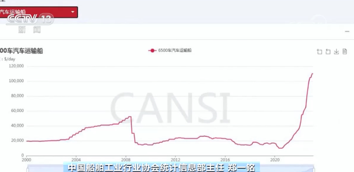 中国船舶工业行业协会统计信息部主任 郑一铭:这个是汽车运输船航运运费的指数的变化。在去年整个指数呈现了直线增长的态势,从年初的3.85万美元每天运费,然后涨到了去年年底的11万美元每天,即使到现在它还没有回落的迹象。