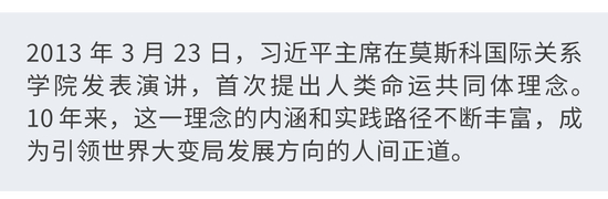 10年来,习近平主席以深邃的历史眼光和博大的天下情怀,相继提出共建“一带一路”倡议、全球发展倡议、全球安全倡议、全球文明倡议,丰富了人类命运共同体理念的内涵和实践路径,为应对世界之变、时代之变、历史之变提供了中国方案。