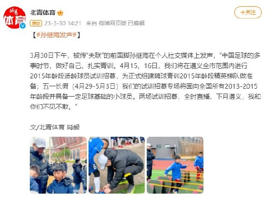 3月30日下午,被传“失联”的前国脚孙继海在个人社交媒体上发声,“中国足球的多事时节,做好自己、扎实青训。4月15、16日,我们将在遵义全市范围内进行2015年龄段适龄球员试训招募,为正式组建嗨球青训2015年龄段精英梯队做准备;五一长假(4月29-5月3日)我们的试训招募专场将面向全国所有2013-2015年龄段并具备一定足球基础的小球员。两场试训招募,全时直播,下月遵义,我和你们不见不散。”