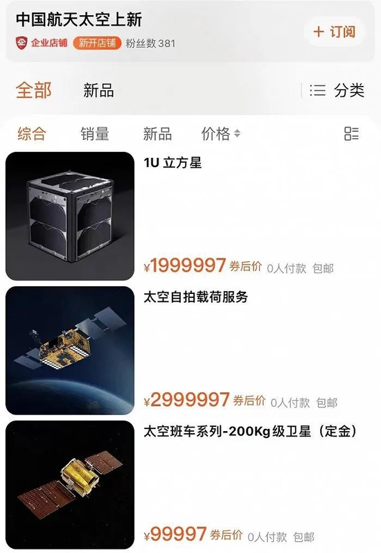 3月30日,“中国航天太空上新”淘宝店上架了3款航天卫星,1U立方星价格约200万元、太空自拍载荷服务约300万、太空班车系列-200Kg级卫星的定金约10万,消费者均可直接下单购买。