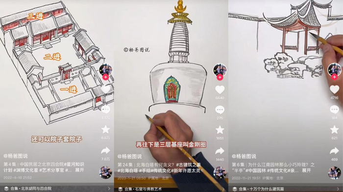 这个4分钟讲清楚北京四合院的视频,在抖音获得了53.5万点赞、8.6万条收藏,网友纷纷表示“画得细致,讲解清楚,风俗民情都有了”“图文声并茂,通俗易懂”“我简直就是来学知识的”。