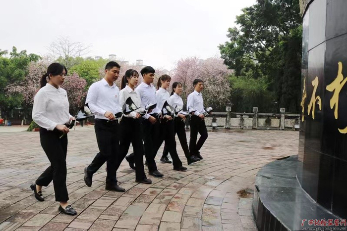 细雨打湿春光,以鲜花祭扫先烈,用思念延续红色精神。图为武宣县纪委监委年轻党员干部向烈士敬献鲜花。(武宣县纪委监委 韦冬妮/摄)