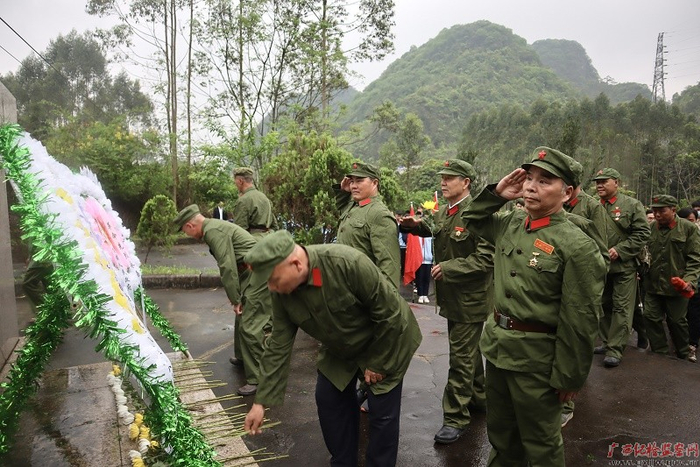 龙州县上龙乡,烈士陵园苍松翠柏掩映。龙州县干部群众代表向烈士献上鲜花,默哀缅怀。(龙州县纪委监委 何年飞/摄)