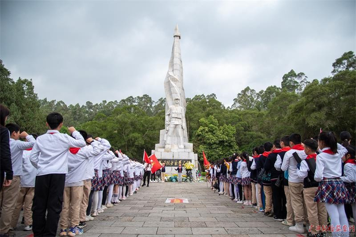 清明时节,在鹿寨县的烈士陵园里,各中小学生前来祭奠革命先烈,赓续红色血脉,表达深切哀思。图为鹿寨县城中小学少先队员们面对烈士碑重温入队誓词。(鹿寨县纪委监委 潘婷/摄)
