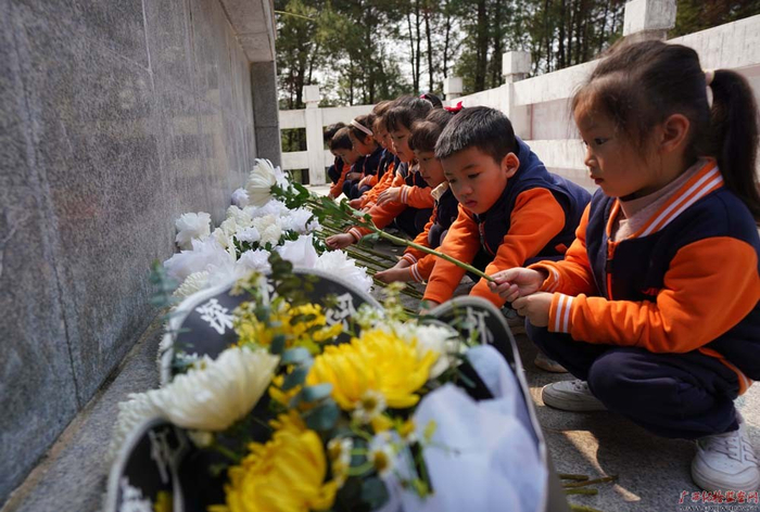 清明时节,融水苗族自治县纪委监委会同县妇联等单位在水东烈士陵园开展“缅怀先烈忆初心·弘扬清廉好家风”主题活动,通过肃立默哀、敬献鲜花、打扫墓碑及重温入党誓词、宣讲廉洁治家等形式,寄托对革命英烈的深深哀思和崇高敬意。图为该县幼儿园小朋友在水东烈士陵园向革命烈士纪念碑敬献鲜花。(融水苗族自治县纪委监委 龙林智/摄)