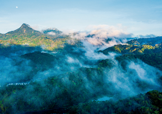 五指山的古木、树藤和附生的兰、蕨、菌类相伴而生;“中国最美十大森林”之一的尖峰岭,云海下显出多彩光影神韵;黎母山脉氤氲的雾气中,瀑布倾泻而下,在盆地中曲流蜿蜒;毛瑞林区里,狼牙般密集竖立的石林和千岩万壑堆砌成奇伟的热带喀斯特地貌;霸王岭中,人类最濒危的“近亲”海南长臂猿开始了清晨第一次放歌;“水中大熊猫”桃花水母张着触手,游弋在鹦哥岭沟谷的雨林湿地;吊罗山喧哗的瀑布声里,小爪水獭重现故园后留下几只清晰的脚印……