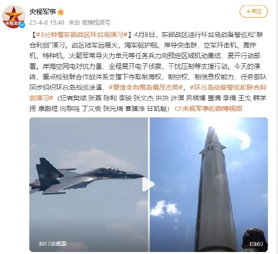 4月8日,东部战区进行环台岛战备警巡和“联合利剑”演习。战区陆军远箱火,海军驱护舰、岸导突击群,空军歼击机、轰炸机、特种机,火箭军常导火力单元等任务兵力向预定区域机动集结,展开行动部署。岸海空网电对抗力量,全程展开电子侦察、干扰压制等支援行动。今天的演练,重点检验联合作战体系支撑下夺取制海权、制空权、制信息权能力,任务部队同步组织环台岛战巡进逼,塑造全向围岛慑压态势。(记者樊斌 张磊 陈利 李骏 张文杰 洪治 许溟 吕晓博 董满 李倩 王戈 韩学扬 康鹏程 向黎鸣 丁文俊 张先瑞 曹臻浩 甘凯魁)