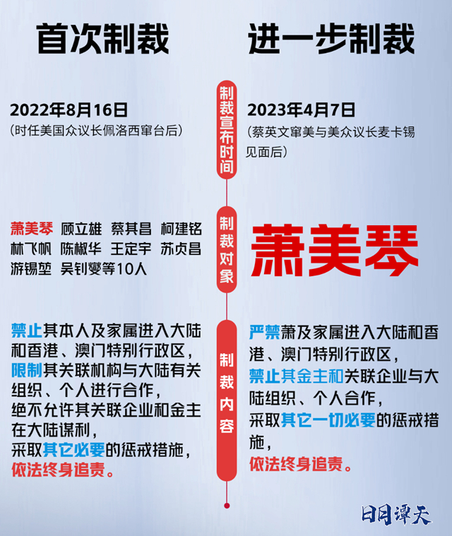 4月7日,中共中央台办发言人受权宣布,对“台独”顽固分子萧美琴实施制裁。