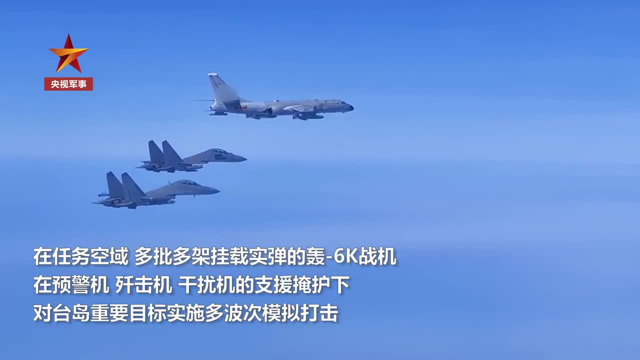 战区空军出动数十架歼击机,持续位台湾海峡与台岛南北两端战巡进逼,依托联合情报支撑,开展寻歼海空舰机、空中封锁演练,构建多向围岛锁台态势。在任务空域,多批多架挂载实弹的轰-6K战机,在预警机、歼击机、干扰机的支援掩护下,对台岛重要目标实施多波次模拟打击。受领慑阻打击任务的火箭军部队闻令而动,采取周边快反、设伏快打、监视打击等战法,对海上移动目标进行火力追瞄,实施大弹量、多波次模拟火力打击。战区海军多艘执行战巡进逼任务的驱护舰,针对性展开突击“敌”疏泊舰船、海上封锁等行动演练。在台湾海峡,台岛西北、西南以及台岛以东海域主动出击,发挥性能优势,灵活机动抢占有利阵位,高速进逼慑阻对手。