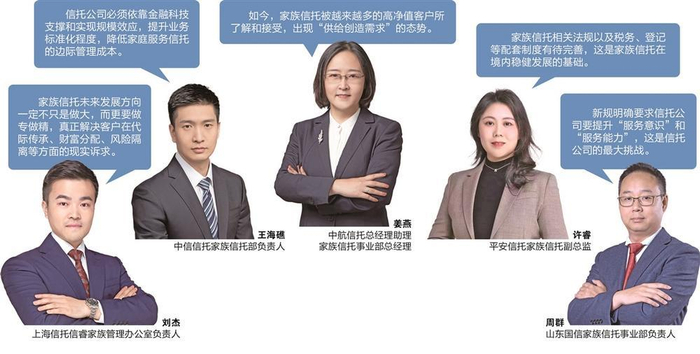 为了拉近家族信托与普通民众的距离,呈现家族信托的真实功用与前景,证券时报记者特此邀约5位业界专家,从一线操刀者的角度解析境内家族信托的发展现状与未来期许,也对近期有关家族信托的多个热点话题分享他们的判断与思考。这5位业界专家分别是中航信托总经理助理、家族信托事业部总经理姜燕,中信信托家族信托部负责人王海礁,上海信托信睿家族管理办公室负责人刘杰,山东国信家族信托事业部负责人周群和平安信托家族信托副总监许睿。