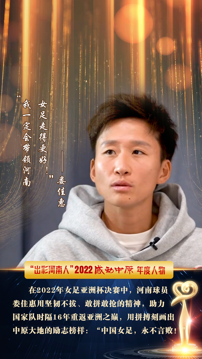 奋勇拼搏、在2022年女足亚洲杯决赛上助力国家队夺得冠军的河南省球类运动中心女子足球队运动员娄佳惠;